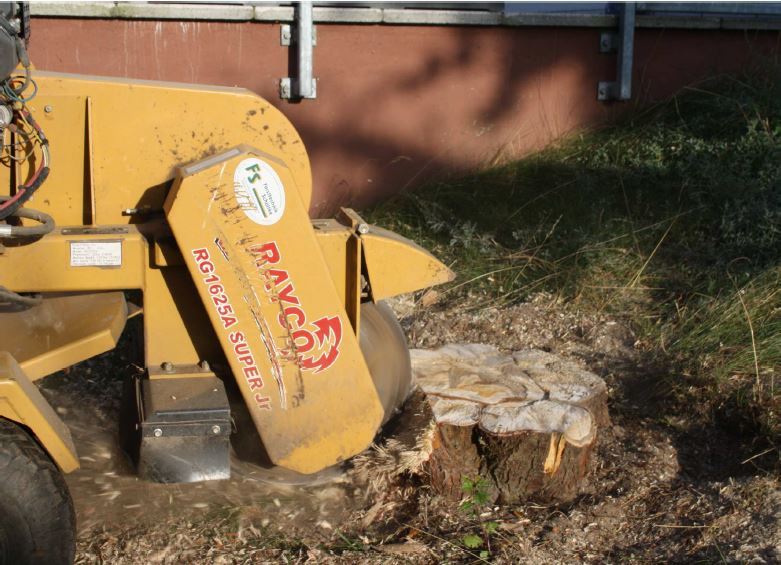Das Fräsen von Stümpfen und Wurzeln, auch an schwer zugänglichen Stellen, ist möglich mit einer selbstfahrenden Stubbenfräse, Durchfahrtsbreite ca. 80 cm und passt damit durch fast jedes Gartentor.